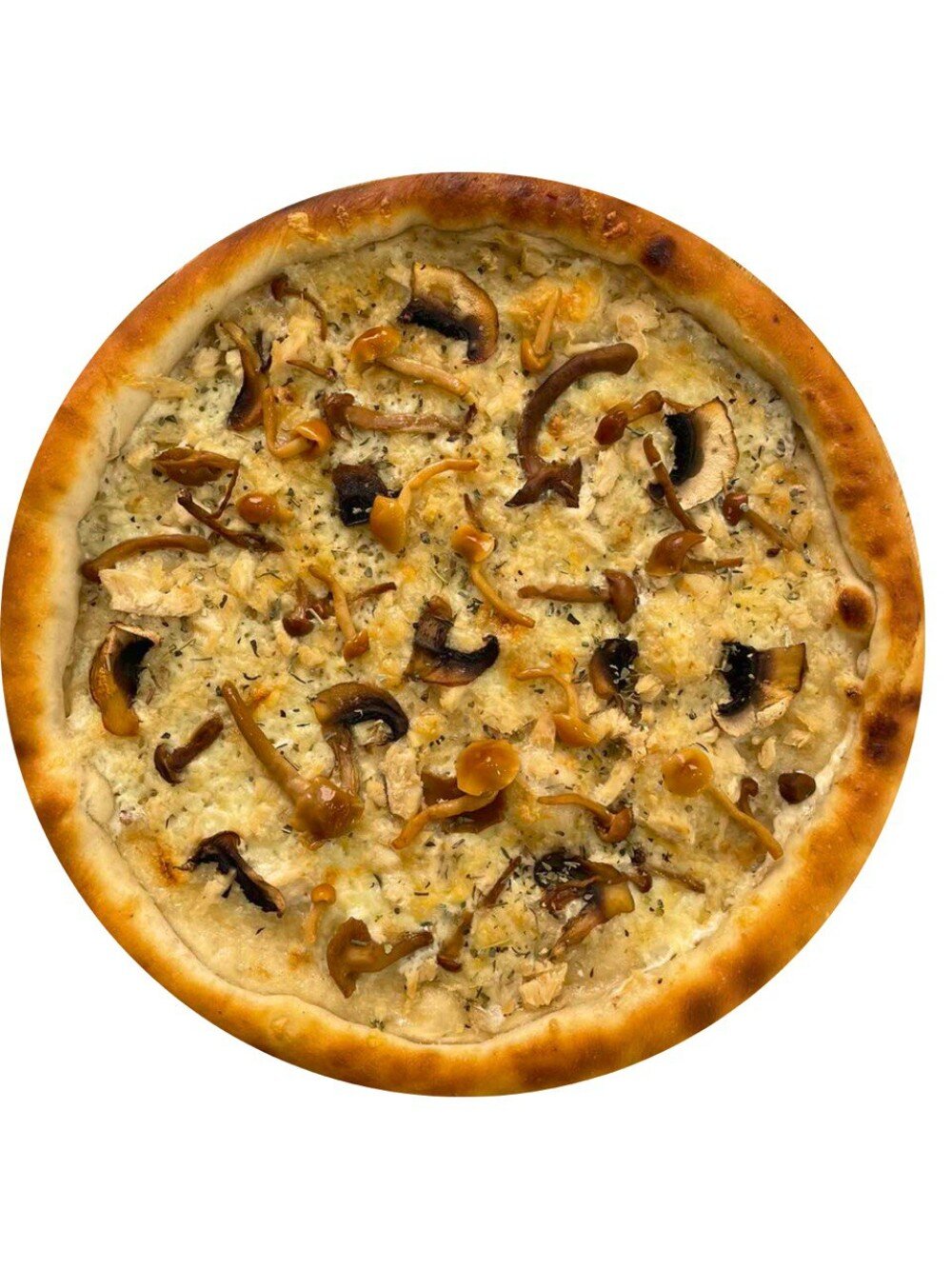 Соус грибной, сыр Моцарелла, шампиньоны, опята маринованные, копченая курица, итальянские травы