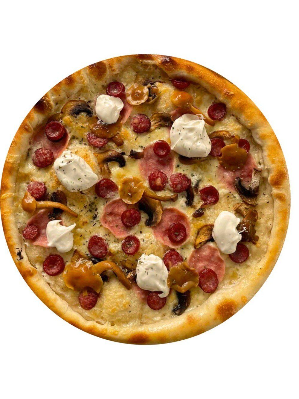 Соус трюфельный, сыр Моцарелла, ветчина куриная, шампиньоны, опята, колбаски охотничьи, итальянские травы