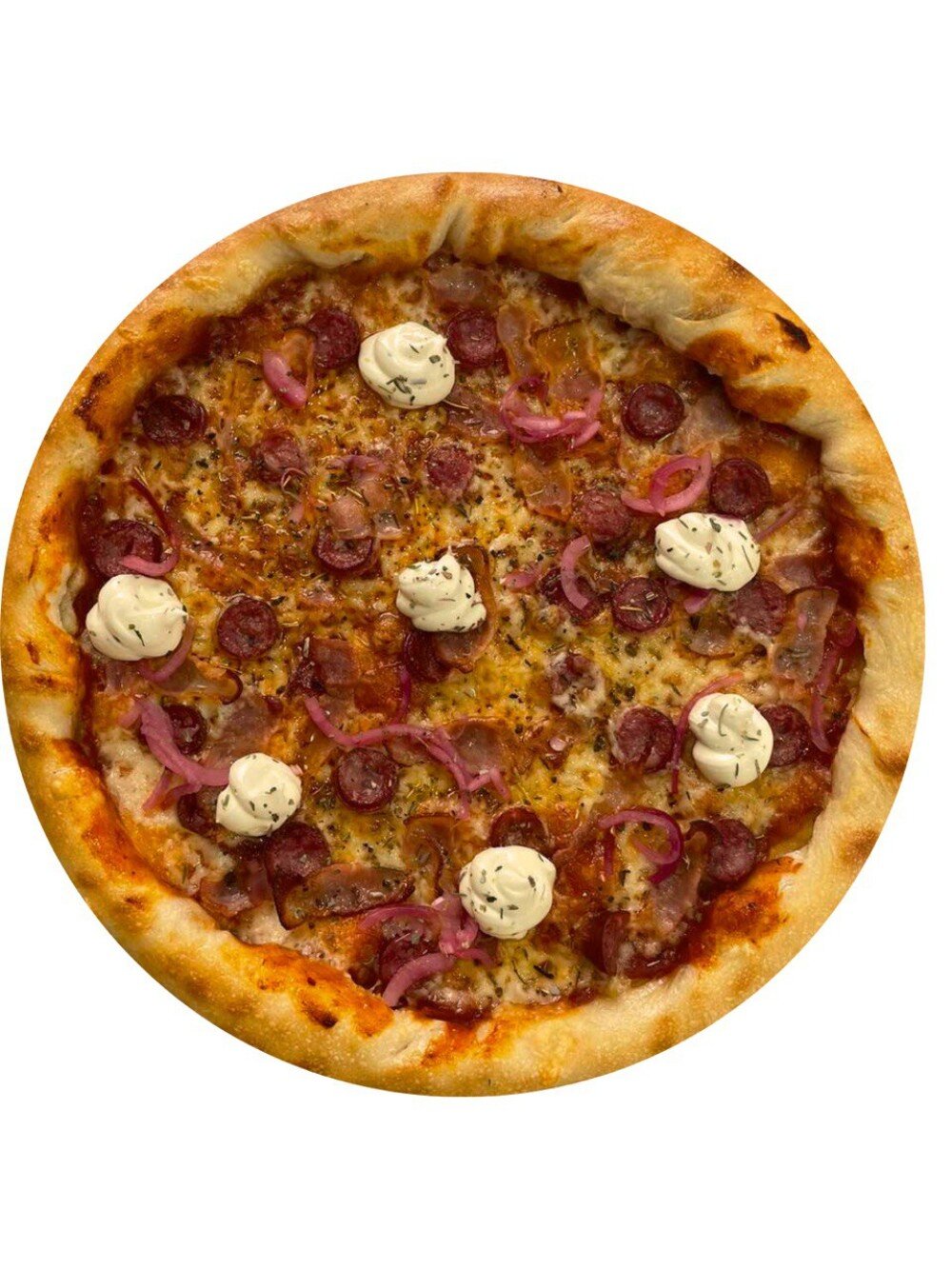 Cоус томатный, соус чесночный, сыр Моцарелла, бекон, колбаски, красный лук, итальянские травы