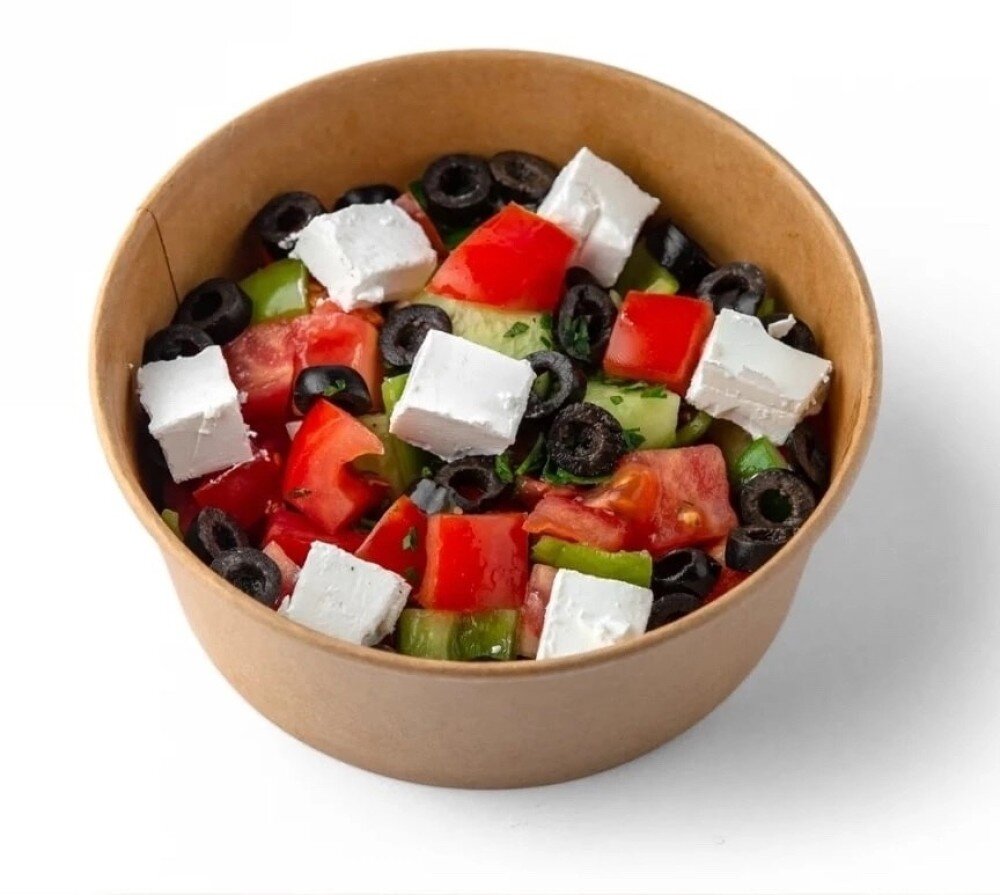 Лёгкий овощной салат представляет собой гармоничное сочетание свежих ингредиентов: сладость болгарского перца дополняется хрустящими огурцами и сочными листьями салата; пикантность придают томаты черри. Фирменная заправка придаёт блюду особую насыщенность вкуса, а кубики мягкого рассольного сыра добавляют сливочную нотку. Маслины : завершают композицию, обогащая её своим ярким ароматом и характерной текстурой.