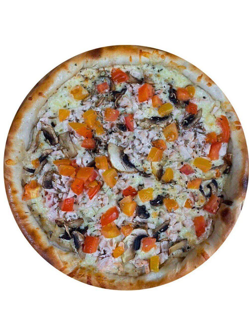 Соус ореховый, сыр Моцарелла, курица копченная, томат, шампиньоны, итальянские травы