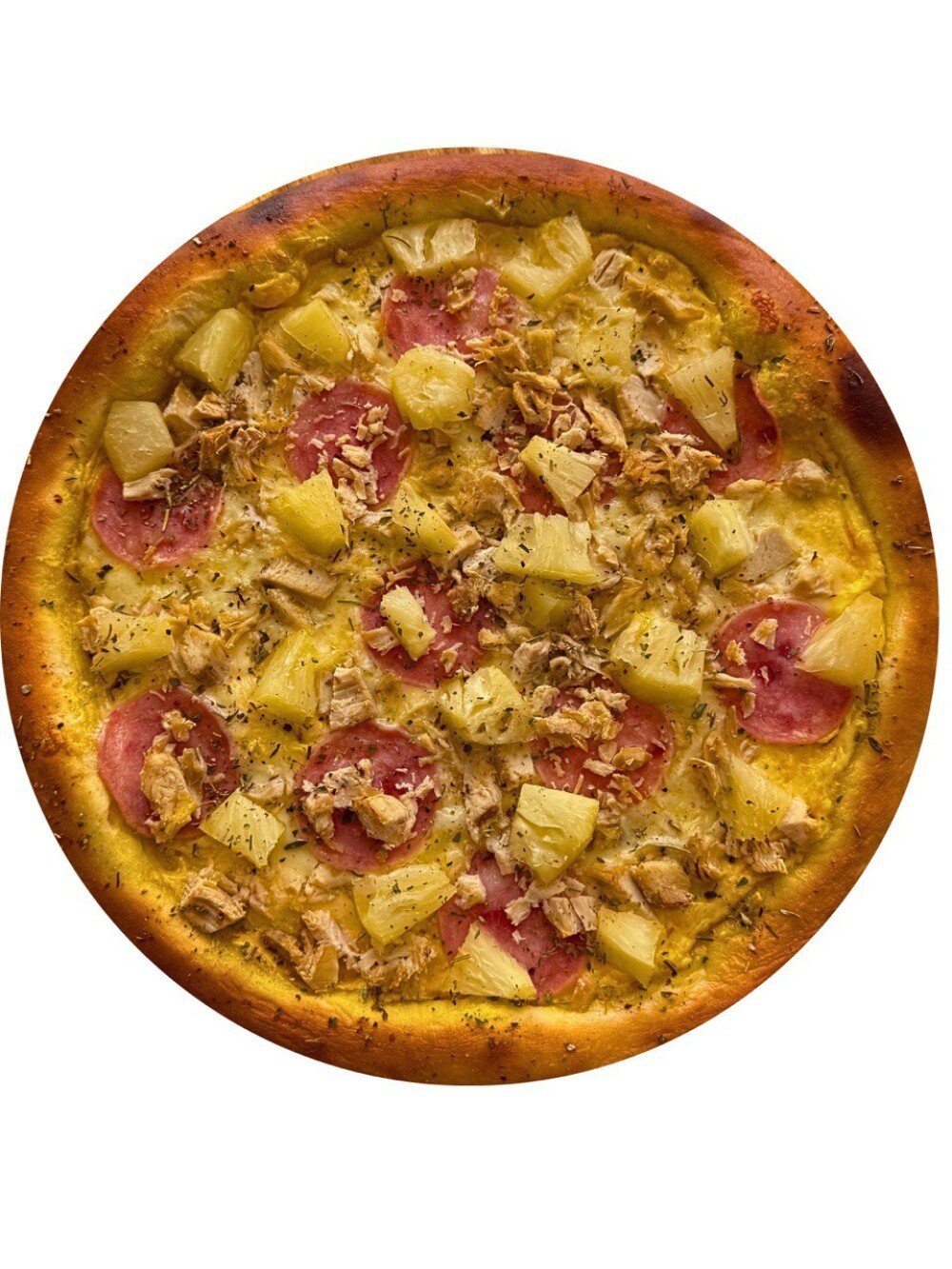 Соус сырный, сыр Моцарелла, курица, ветчина, ананас, масло розмариновое, итальянские травы
