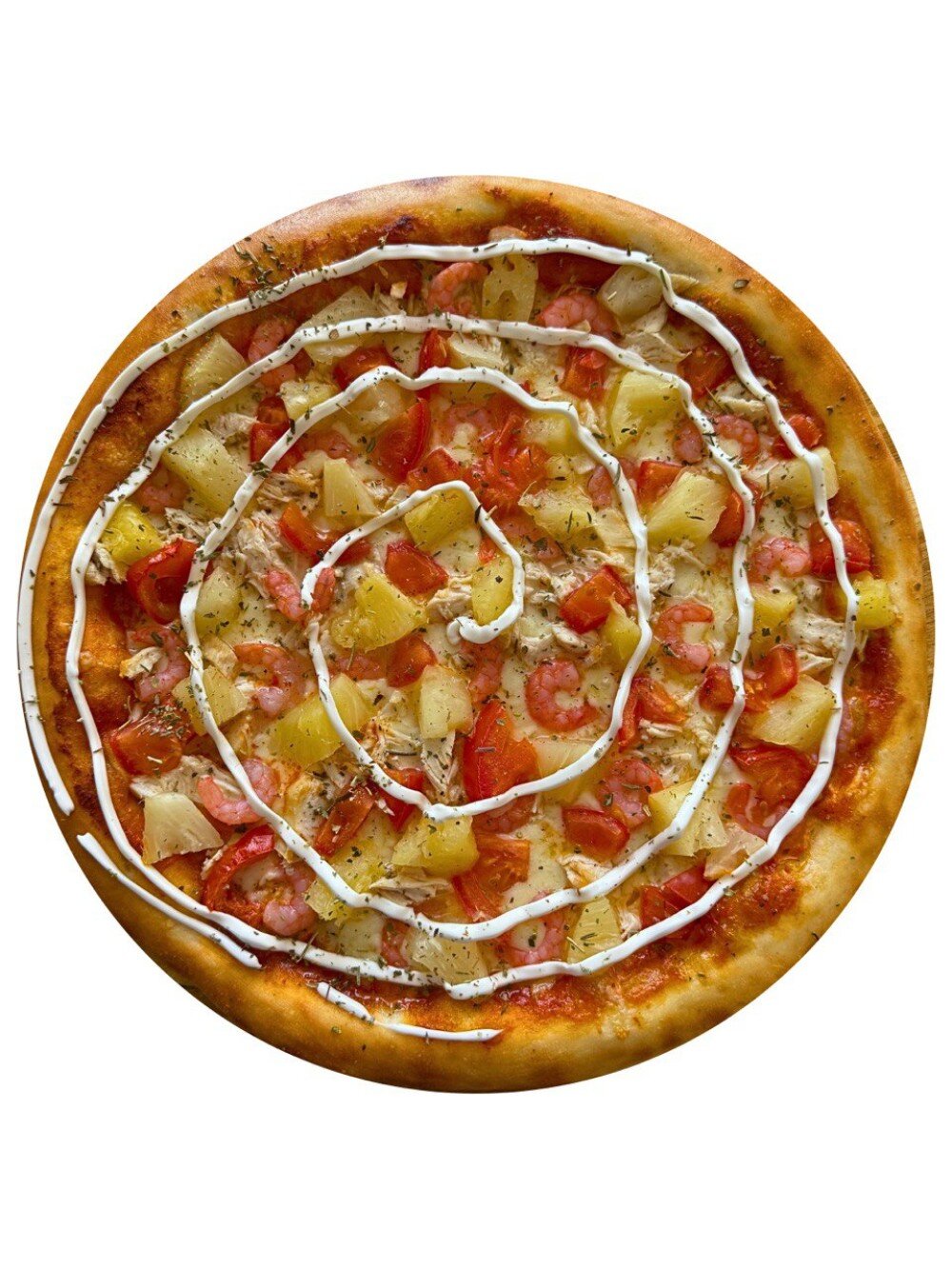 Соус том ям, сыр, ананас, курица, креветка, томат, итальянские травы
